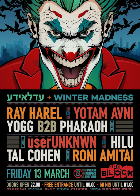 "זו הייתה שעתם היפה ביותר" אמר פעם צ'רצ'יל (לא אבא של אוריה, השני), וגם אנחנו מאמינים שכל משבר הוא שער המוביל לשלב הבא. מועדון הבלוק גאה להציג: שישי ה-13 במרץ 2020 - סוף העולם פרק ב', עדלאידע ווינטר מאדנס בדרום הפרוע: פתיחת דלתות 22:00, חינם למקדימים עד 00:00, 60 ש"ח עד 01:00. בלוק - למרות השמועות המוקדמות, פורים עדיין חי ובועט. בתוכנית האמנותית: פתיחה של ריי "אושיית הלילה" הראל, מיין של יותם "כסף לתרופות" אבני וסגירה של הרזידנטים, המפיקים, התקליטנים והלייבל בוסים יוג ופרעה. חצר / סקוואט - ציליה, וידאו ארט ותנורים בנוהל ברחבה שתציל את העולם, עם פתיחה של יוזר לא ידוע, מיין של טל "הקיק" כהן וסגירה של הילה "מפצחת הקוד הגנטי" לובמן א.ק.א הילו. לאונג' - השתלטות ידידותית למדי של רוני אמיתי של חדר הקונצרטים של המתחם. Friday 13.3.2020 at the wild wild south ~ ~ ~ עדלאידע WINTER MADNESS ~ ~ ~ Doors Open: 22:00, Free Entrance until 00:00 60 NIS until 01:00 - - - - BLOCK - - - - Ray Harel - The Block, Slippers.99, Tel-Aviv Yotam Avni - Kompakt, Tel-Aviv Yogg b2b Pharaoh - The Block, Parallax, Tel-Aviv - - - - YARD / SQUAT - - - - ? - userUNKNWN Tal Cohen - The Block, Tel-Aviv Hilu - The Block, Tel-Aviv Visuals (loops) by Cote, Noetic - - - - LOUNGE - - - - Roni Amitai - Dov Gummy, Tel-Aviv - - - - - - - - - - - - - - - - - - - - - - - - - שימו לב - הכניסה מגיל 23 ומעלה בהצגת תעודת מזהה בלבד.קוד לבוש: אין כניסה עם כפכפים או עקבים גבוהים. כשהמקום מלא תינתן עדיפות בכניסה לחברי מועדון ולמוזמנים. שימו לב 2 - בהתאם להנחיות משרד הבריאות, מי שהיה מחוץ לישראל בשבועיים האחרונים מתבקש לא להגיע, תושבים זרים שהגיעו לישראל בשבועיים האחרונים לא יורשו להיכנס. According to the health ministry regulations, anyone who has been outside of Israel for the past two weeks is asked not to come. Foreign residents who have landed in Israel in the past two weeks will not be allowed to enter