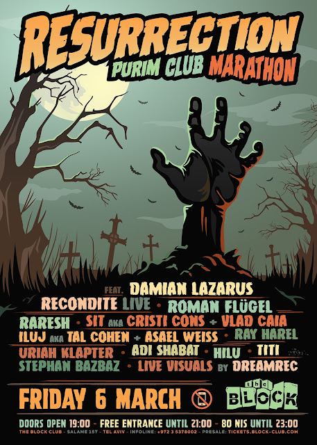 תחיית המתים - פורים קלאב מרתון מורבידי בשלוש רחבות + חצר אורבנית בניצוחה של נבחרת נוצצת של גיבורי מחתרת מקומיים ואורחים מחו"ל, מ-19:00 בערב שישי ועד שבת בצהרים.